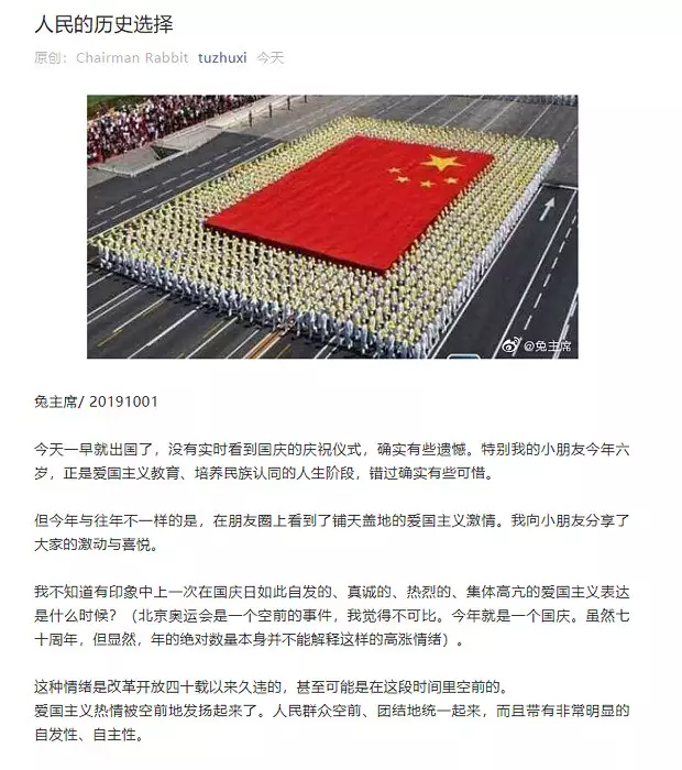 內地微博大V兔主席在國慶寫文,題為:人民的歷史選擇