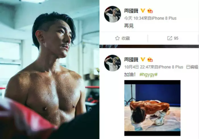 周國賢昨夜於ig和微博上載掌上壓照,留言:「加油!#hgygy(香港人加油)」。在微博發這文,周國賢應該都預計到遭受網民狙擊,今早他再發文留言:「再見」。