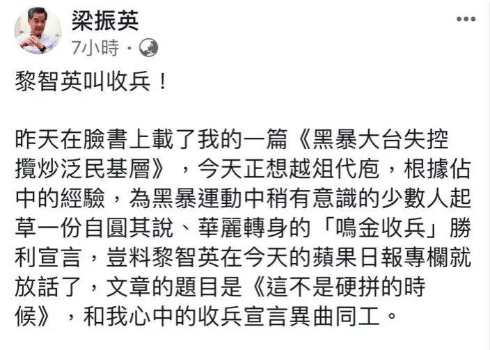 昨天在臉書上載了我的一篇《黑暴大台失控 攬炒泛民基層》,今天正想越俎代庖,根據佔中的經驗,為黑暴運動中稍有意識的少數人起草一份自圓其說、華麗轉身的「鳴金收兵」勝利宣言,豈料黎智英在今天的蘋果日報專欄就放話了,文章的題目是《這不是硬拼的時候》,和我心中的收兵宣言異曲同工。