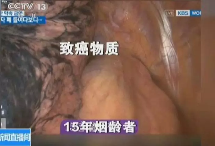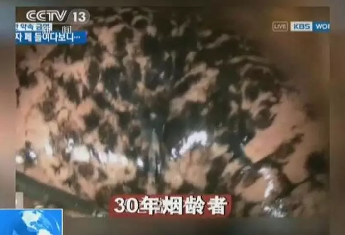 南韓KBS電視台公開內窺鏡下煙民肺部的影片,發現非吸煙者的肺呈現鮮明的淡粉紅色,只有少許大氣污染物質造成的小灰點;但15年煙齡人士的肺部則滿佈焦油沉積而成的大塊黑斑,更恐怖的是30年煙齡的人,肺部好似被濃厚墨汁污染。