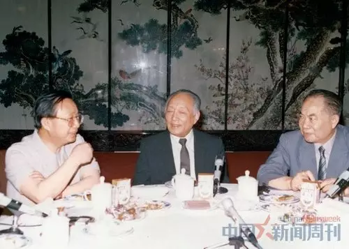 1991年6月11日,常務國務院新聞辦主任朱穆之( 中)、常務副主任曾建徽(左)、周覺(右)首次會見中外記者及外國駐華使館新聞官員。圖/CNSPHOTO