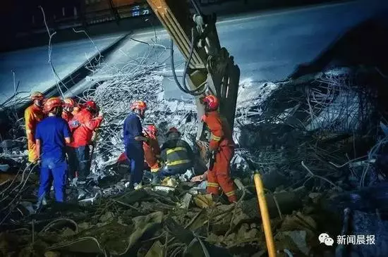 02:30,從被壓的白色橋車駕駛室中找到一具遇難者遺體,這是本次事故中的第一個遇難者。負責搜救的消防員把遺體放上擔架,蓋上白布,在場的所有人脫帽、默哀。