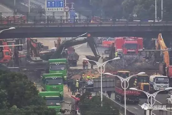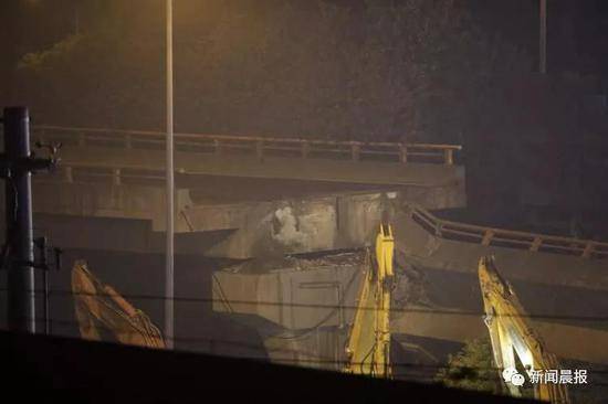 等到三輛被在橋面下的車輛完全清理出來後,現場開始對側翻的橋面進行分段拆除。