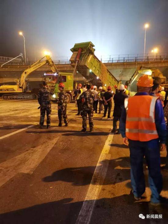 11日00:00,吊車已經到位,其實此前完成吊車的配重安裝已經花去了半個小時。但吊車並沒有立即啟動,幾輛滿載著黃沙的重型土方車出現在錫港路上,它們把成噸的黃沙傾倒在側翻的橋面下方,很快就堆出了一座小山。