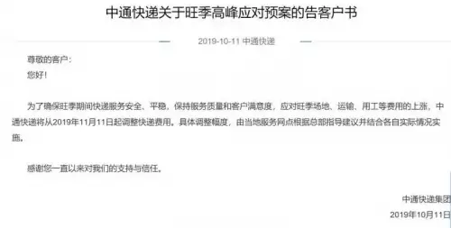 為何調價?中通快遞解釋,為確保旺季期間快遞服務安全、平穩,保持服務質量和客戶滿意度,應對旺季場地、運輸、用工等費用的上漲。