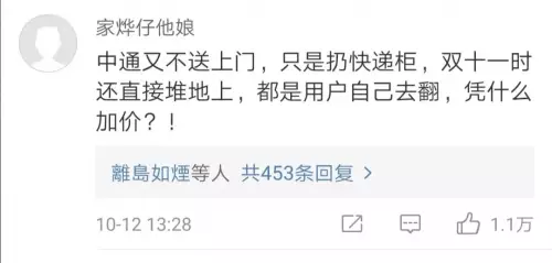 一位網友明確表態反對加價:「中通快遞又不送上門,只是扔快遞櫃,雙十一時還直接堆地上,都是用戶自己去翻,憑什麼加價?!」該條評論在微博上獲得了超過一萬的點贊數。