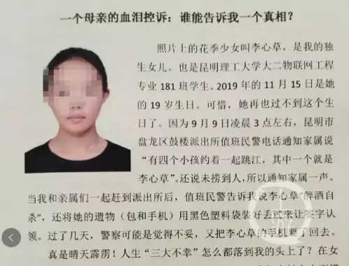 10月14日清晨,媒體援引昆明警方說法稱,備受網路輿論關注的昆明理工大學在讀大二女生李心草落水死亡一事有了初步調查結論:李心草為意外落水,尚不構成刑事案件。