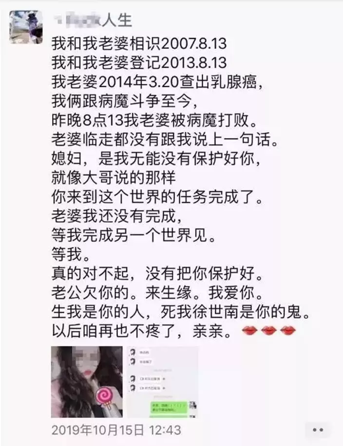可惜楊柳還是不敵癌魔,10月14日逝世,終年34歲。徐世南傷心的寫道:「老婆臨走都沒有跟我說上一句話。媳婦,是我無能,沒有保護好你。你來到這個世界的任務完成了,老婆我還沒有完成,等我完成另一個世界見。等我。」