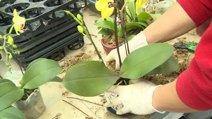員工正忙着把蘭花移盆。