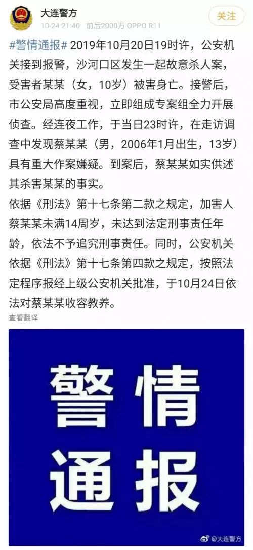 據大連市公安局10月24日通報:10月20日19時許,公安機關接到報警,沙河口區發生一起故意殺人案,受害者某某(女,10歲)被害身亡。接警後,市公安局高度重視,立即組成專案組全力開展偵查。經連夜工作,於當日23時許,在走訪調查中發現蔡某某(男,2006年1月出生,13歲)具有重大作案嫌疑。到案後,蔡某某如實供述其殺害某某的事實。