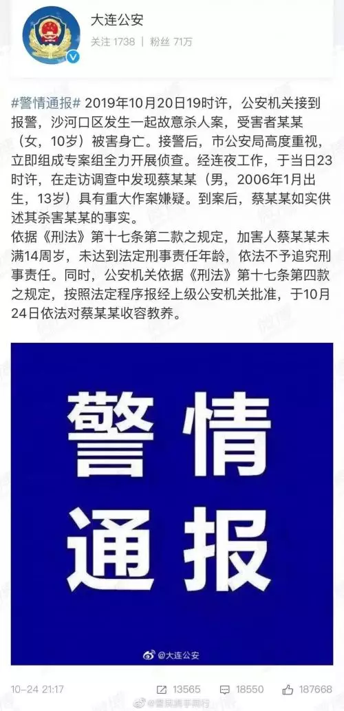 據大連市公安局10月24日晚間通報,稱2019年10月20日19時許,公安機關接到報警,沙河口區發生一起故意殺人案,受害者某某(女,10歲)被害身亡。接警後,市公安局高度重視,立即組成專案組全力開展偵查。經連夜工作,於當日23時許,在走訪調查中發現蔡某某(男,2006年1月出生,13歲)具有重大作案嫌疑。到案後,蔡某某如實供述其殺害某某的事實。