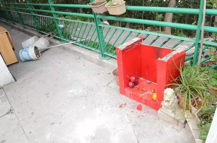 今早接近8點,秀茂坪邨巴士總站站長室背後的一幅外牆,被人用噴漆寫上「在此理髮死全家」的黑色大字。連帶旁邊的地主公神位也遭殃,被推倒並扔到山坡下面。