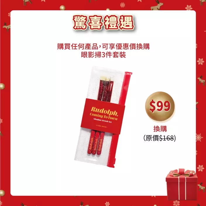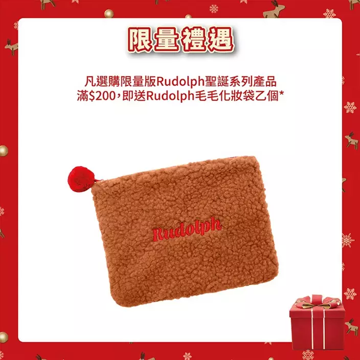 現在選購Rudolph聖誕系列產品滿$200,更會即時送上Rudolph 毛毛化妝袋1個!凡購買任何產品,就可以用優惠價 $99 換購Rudolph 眼影掃套裝!另外還有非常多節日驚喜優惠,是時候買聖誕禮物給自己以及好友了!