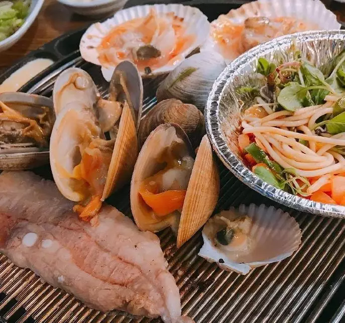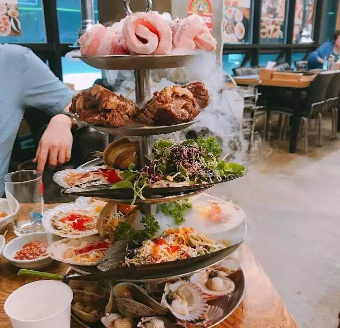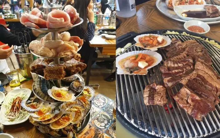 旅行去到釜山,怎麽能不嘗嘗當地新鮮平價海鮮?位於廣安里附近的這間餐廳(풍성숯불돼지갈비)最近因外觀震撼的「千層海鮮烤肉塔」成為了釜山的人氣餐廳!這家店主打「千層烤肉」,各種食材多層擺盤,有3-6層選擇,套餐包括了釜山當地新鮮的時下海鮮鮑魚、大蝦、多款貝殼海鮮,加上五花肉、調味豬扒、烤大腸等,一層層曡放在眼前,堆積如山,看著就非常震撼,味道吃起來也是超級美味。
