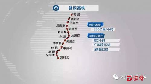 贛深鐵路是我國「八縱八橫」高速鐵路網的重要組成部分,線路從在建的贛州西站引出,向南接入深圳北站。贛深鐵路正線全長436.37公里,線路貫穿江西、廣東兩省的贛州、河源、惠州、東莞、深圳5市。列車設計行駛速度為350公里/小時,規劃運輸能力為5000萬人/年。目前贛深鐵路全線正在加快建設,按照計劃將於2021年建成通車,屆時深圳至河源高鐵只需要1個小時。