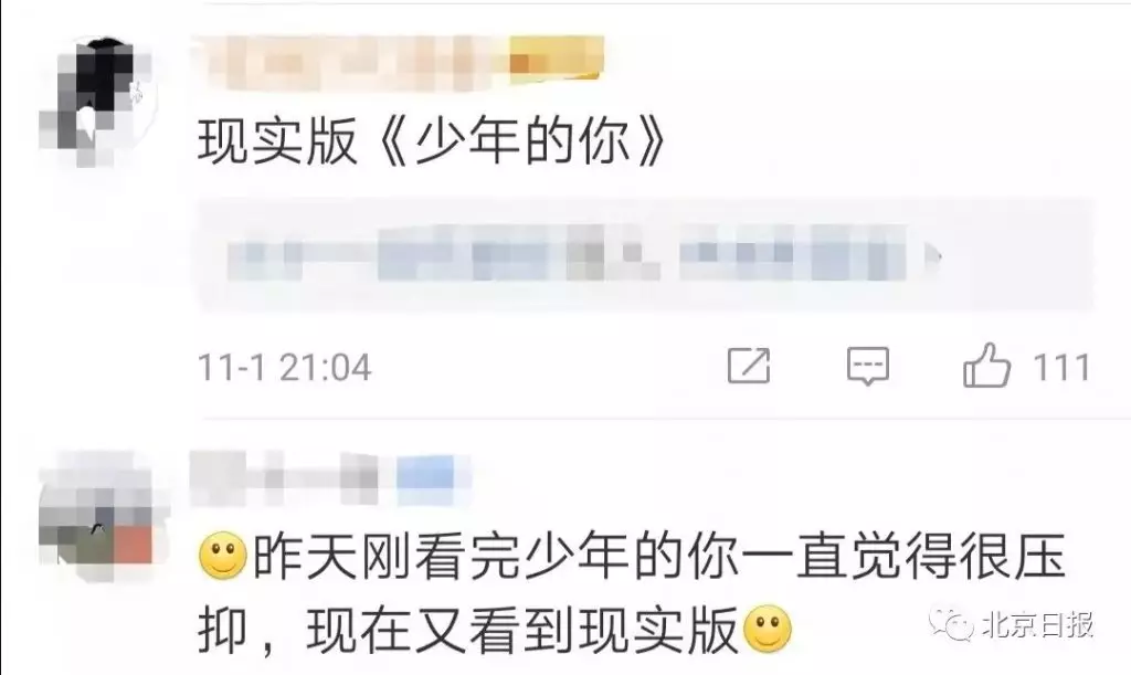 張嬌媚和楊珂禕艱難地扶著老人,頂著風雨,一路蹣跚,把老人送到了學校門衛處。此時,老人和孩子都已經渾身淋濕。14歲的張嬌媚說:「中途要攙扶老人,用手臂給老人擋雨,我和珂禕也摔了幾次。」到了學校,她發現自己和楊珂禕變成了「大泥臉」。