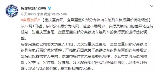 成都局集團公司:對重慶至貴陽、宜昌至重慶部分高鐵動車組列車執行票價優化調整,總體有升有降,涉及170餘趟列車,最大折扣幅度5.5折。
