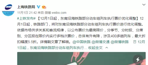 11月1日晚,中國鐵路上海局集團公司發佈消息,12月1日起,按以公佈票價為高限,適應市場需求,實行靈活折扣的差異化定價機制,對東南沿海鐵路部分動車組列車的執行票價進行優化調整。