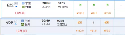 又如寧波到台州,每晚8點49分的G59次,目前票價是二等座53元,一等座85元,商務座160元,調價後,二等座50元,一等座81元,商務座152元。