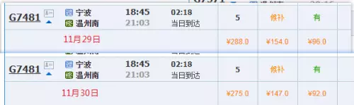 11月29日寧波開往溫州南的G7481次,二等座96元,一等座154元,商務座288元,調價後,11月30日和12月1日,這趟車二等座只要92元,一等座147元,商務座275元,稍微便宜了一些。
