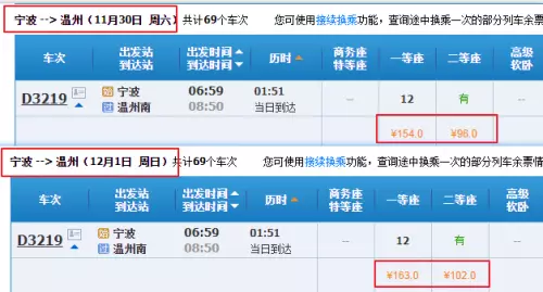 比如目前買11月30日寧波開往溫州南最早一班的D3219次,二等座票價96元,一等座154元,而12月1日這趟車票價調整為了二等座102元,一等座163元。