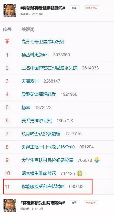 (董湘依)昨日(4日)下午,「你能夠接受租房結婚嗎」的話題衝上熱搜榜,截至發稿時,該話題閱讀量超1億,討論數1.3萬。顯然,廣大網友對這個話題產生了強烈共鳴,在評論區的探討也十分精彩。
