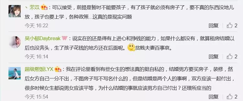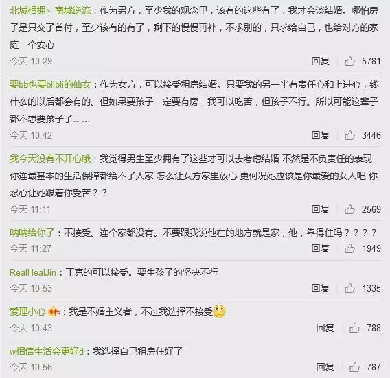通過網友們的熱烈討論可以看出,是否接受租房結婚的確是因人而異,而男生和女生之間的看法也有較大差異,有的人認為應該有充分的物質基礎才會考慮結婚,有的人則表示可以通過兩人共同奮鬥買房,還有很多看法在此不一一列舉。
