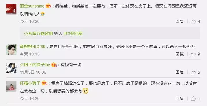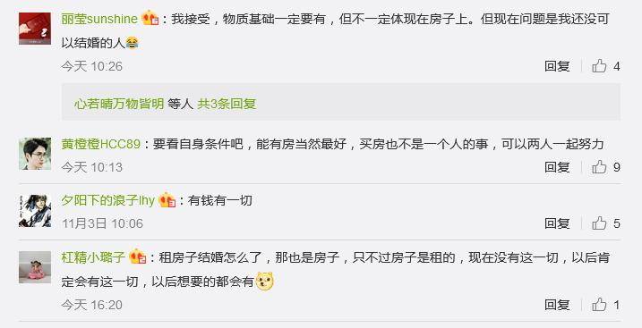 @喜歡睡覺和小說:假如我自己有能力買房,我當然不在乎心愛的他有沒有房子啦。我假如沒有能力買房,我會希望對方有,沒有的話我們一起努力。