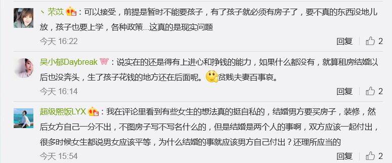 也有網友對自己的人生規劃較為清晰,表示可以在不同的年齡階段做不同的事。比如,有女性網友稱,「如果我35歲以下,對方各方面能力較強,那我可以接受租房結婚,畢竟我看中的是對方的“才」,我們還年輕有時間去奮鬥去做財富積累!但是如果我已過35歲,我不能接受租房結婚,因為年齡大了,後續很多實際問題接踵而來,到時經濟壓力會相當大!”