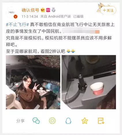 @確認信號微博配圖顯示,一名身著非航空制服、未帶任何證件的年輕女性,在駕駛艙內單手做「V」型手勢拍照,圖片中還配有“超級感謝機長,實在是太開心了”的文字。在另一張圖片中,可以看到駕駛艙內有紙質水杯以及陶瓷茶具等物體。記者注意到,該微博留言評論中,多名航空相關人士分析,該女子拍照所處駕駛艙並非模擬艙,而是正在飛行的航班。