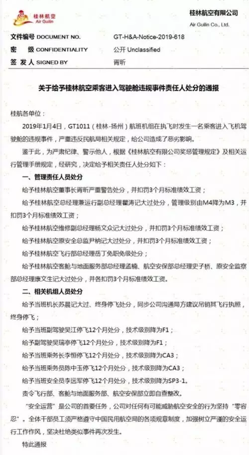 11月5日,網路上流傳一份桂林航空的處分通報顯示,鑒於該違規事件帶來的惡劣影響,給予自董事長、涉事相關職能部門高管至機組人員不同程度的處分。其中,給予桂林航空董事長警告處分,並扣罰3個月標準績效工資,其他涉事相關部門高管、機組人員也被予以不同程度處分。不過,按照桂林航空方面的說法,一切以公司官微通報為準。