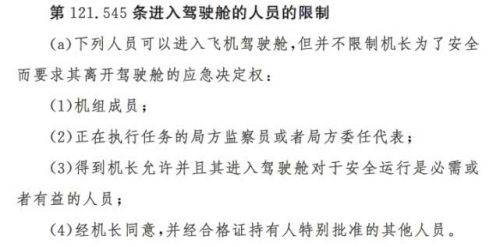 交通運輸部《大型飛機公共航空運輸承運人運行合格審定規則》對於進入駕駛艙人員有明確要求:包括機組成員、正在執行任務的民航局監察員或委任代表、得到機長允許並且其進入駕駛艙對於安全運行是必需或者有益的人員,以及經機長同意、並經合格證持有人特別批准的其他人員,可以進入飛機駕駛艙。也就是說,乘客並不能被允許進入飛機駕駛艙。