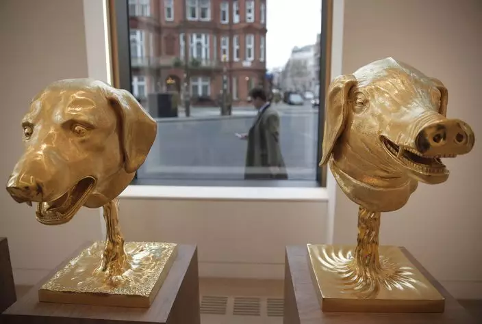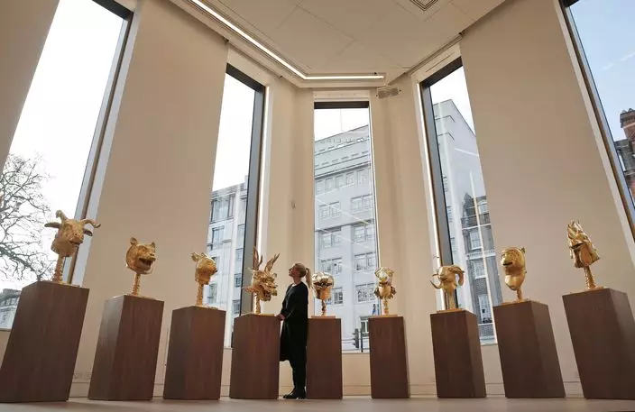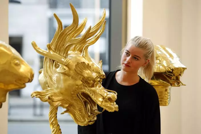 這一套12件的作品,在倫敦菲利普斯拍賣行的當代藝術品拍賣會上,創下最佳成績。十二件獸首包括鼠、牛、虎、兔、龍、蛇、馬、羊、猴、雞、狗和豬。每一隻金獸首都鑲嵌在金色的底座上。