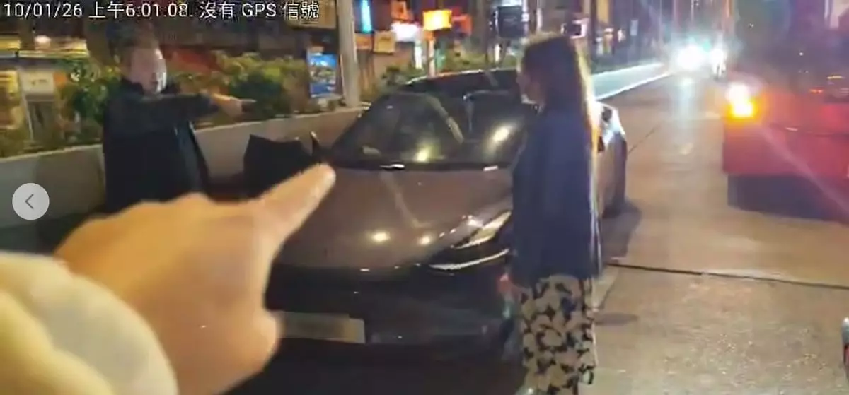 外籍女子向Tesla私家車投擲類似手機的物體。網上影片截圖