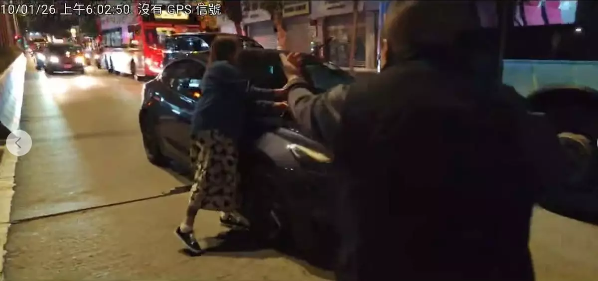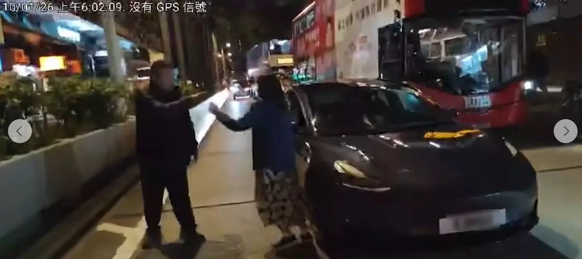 網上流傳的影片可見,一名身穿藍色外套、碎花裙的外籍女子坐在尖沙咀美麗都大廈對開的彌敦道馬路上,前方有一架深色Tesla私家車。一名的士司機駛經見狀,停車喝問,這時該女子向Tesla私家車投擲類似手機的物體,的士司機下車喝止。女子走向Tesla私家車車旁,企圖破壞倒後鏡,私家車司機和的士司機分別喝止女子停手,其間女子又試圖拗斷私家車的水撥,司機上前制止。