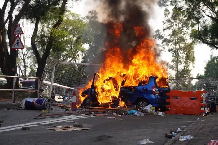 一輛藍色本田私家車被示威者破壞,及縱火燃燒做路障,現場火勢猛烈。其餘示威者後退,警員再度向示威者方向發射催淚彈。