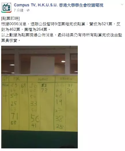 香港大學學生會退出學聯的公投周五晚上開始點票,贊成退出學聯的票數一路領先,根據香港大學學生會校園電視在Facebook專頁上的貼文,至零晨零時56分消息,退聯公投暫時完成點算9個票箱:贊成為521票,反對為462票,棄權為264票。