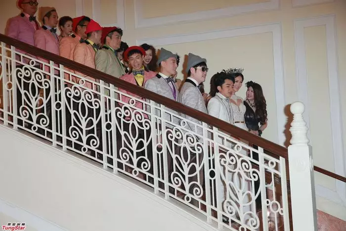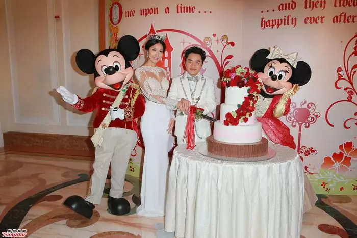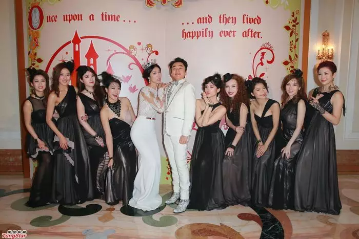下午五時許,兄弟姊妹團分別以「小矮人」與「巫婆」造型進場,招呼入席來賓。一對新人亦以全白禮服從樓梯走下,並與經典卡通人物一起切餅。