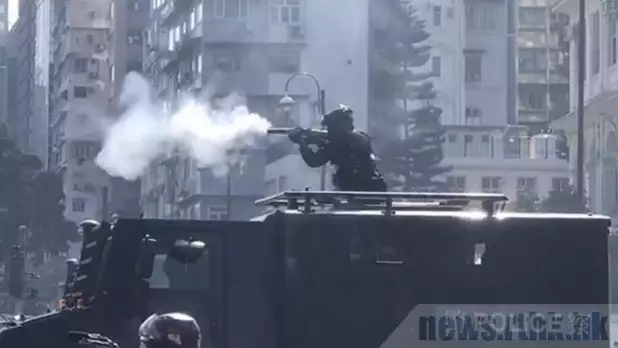 速龍小隊警員站在裝甲車頂部,近距離向示威者方向發射催淚彈。(戴旭亮攝)