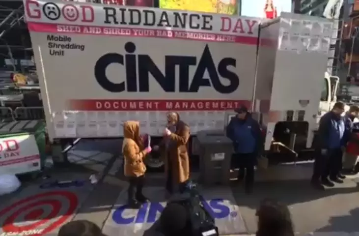 紐約時代廣場日前舉行每年一度的「大解脫日」(Good Riddance Day)活動,大除夕前三日連續舉行,出動工業用大型碎紙機,讓美國人和遊客寫下2013年的不愉快回憶,並用碎紙機碎掉,寓意來年有個好開始。