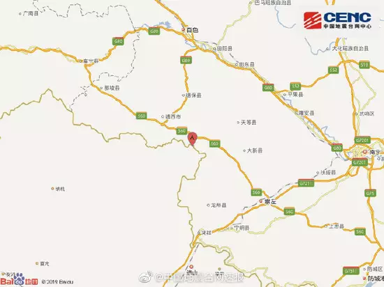 中國地震台網自動測定:11月25日09時18分在廣西崇左市大新縣附近(北緯22.90度,東經106.71度)發生5.0級左右地震,最終結果以正式速報為準。