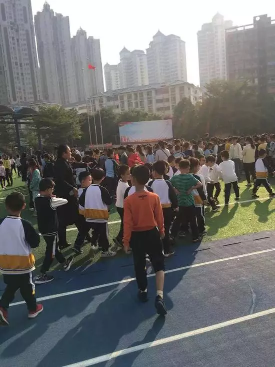 △據南寧市桂雅路小學家長提供照片顯示,地震發生後學生在老師的帶領下紛紛撤離到操場。