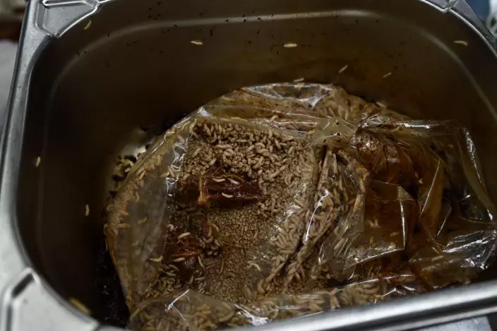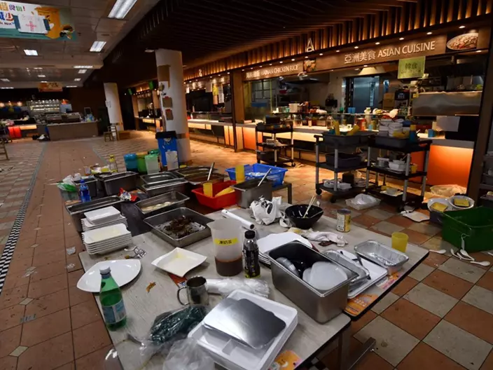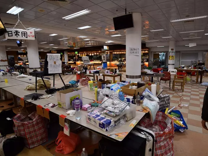 理大爆發激烈警民衝突,警方封鎖理大至今,校内仍有估計數十名示威者留守。校内衛生環境惡劣,四處堆滿雜物垃圾,學生飯堂傳出陣陣異味,廚餘更爬滿大量蛆蟲,但仍見有留守者從厨房尋找食物。