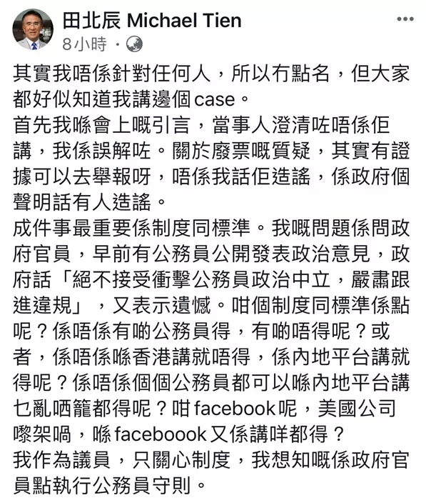 田北辰期後於社交平台facebook回應,承認自己誤解咗當事人批評有關林鄭月娥施政的言論,但對於廢票的質疑,佢重申「唔係我話佢造謠,係政府個聲明話有人造謠。」,佢又重申,唔係針對任何人,作為議員只關心政府官員點執行公務員守則,現行機制會否有雙重標準,「係唔係喺香港講就唔得,係內地平台講就得呢?」