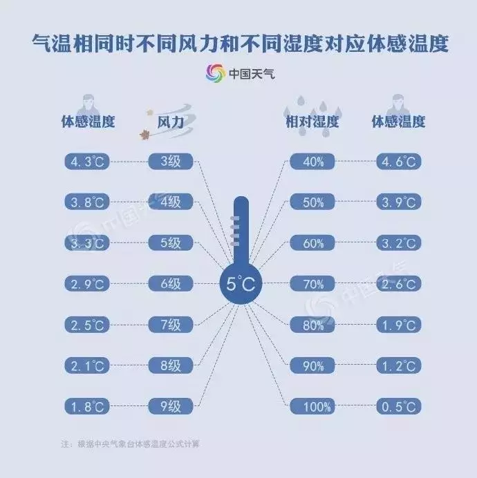 根據中央氣象台的體感溫度公式,在5℃時,相對濕度達70%,體感溫度為2.6℃;如果相對濕度達到90%,體感溫度僅有1.2℃。北方在氣溫為5℃的條件下,颳起7級大風時,體感溫度為2.5℃,疊加9級大風時才會達到1.8℃。
