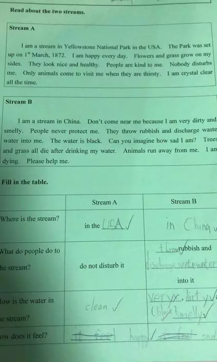 A河流説,我是在美國黃石國家公園,此公園在1982年3月1日成立,我每天都很開心,花草生長在我的兩旁,他們看起來美麗及健康,人們都友善對待我,沒有人騷擾我,間中有動物口渴時,會來探訪我,我無時無刻都是像水晶般清澈。