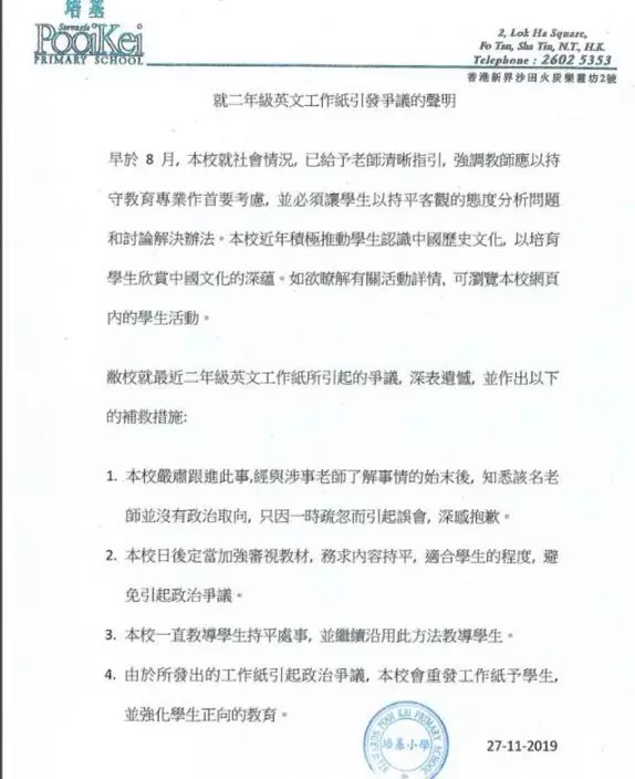 後來培基校方發了聲明。內容提到:早於八月,學校已就社會情況,給予老師清晰指引,強調教師應以持守教育專業作首要考慮,並必須讓學生以持平客觀的態度分析問題和討論解決辦法。學校近年積極推動學生認識中國歷史文化,以培育學生欣賞中國文化的深蘊。