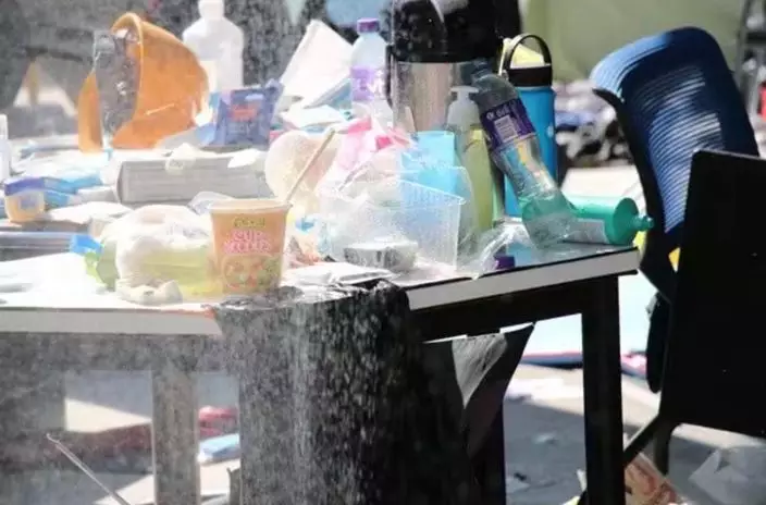 校園裡雖有幾處貼著「請勿弄污,保持清潔」,但現實情況卻讓這句勸言變得諷刺。即食面和粥凝固在餐具里,蘋果已經變灰,腐爛的氣息瀰漫在食堂,人一走進,蒼蠅便飛起來。包裝袋被隨意丟棄,廢紙和落葉在風中打旋。校長見記者時稱,飯堂是最想要盡快清理之處。
