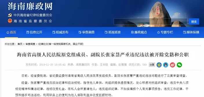 海南廉政网發佈张家慧立案審查通知。(網上圖片)
