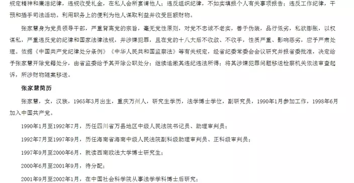 中紀委指張家慧善於偽裝、品行低劣。